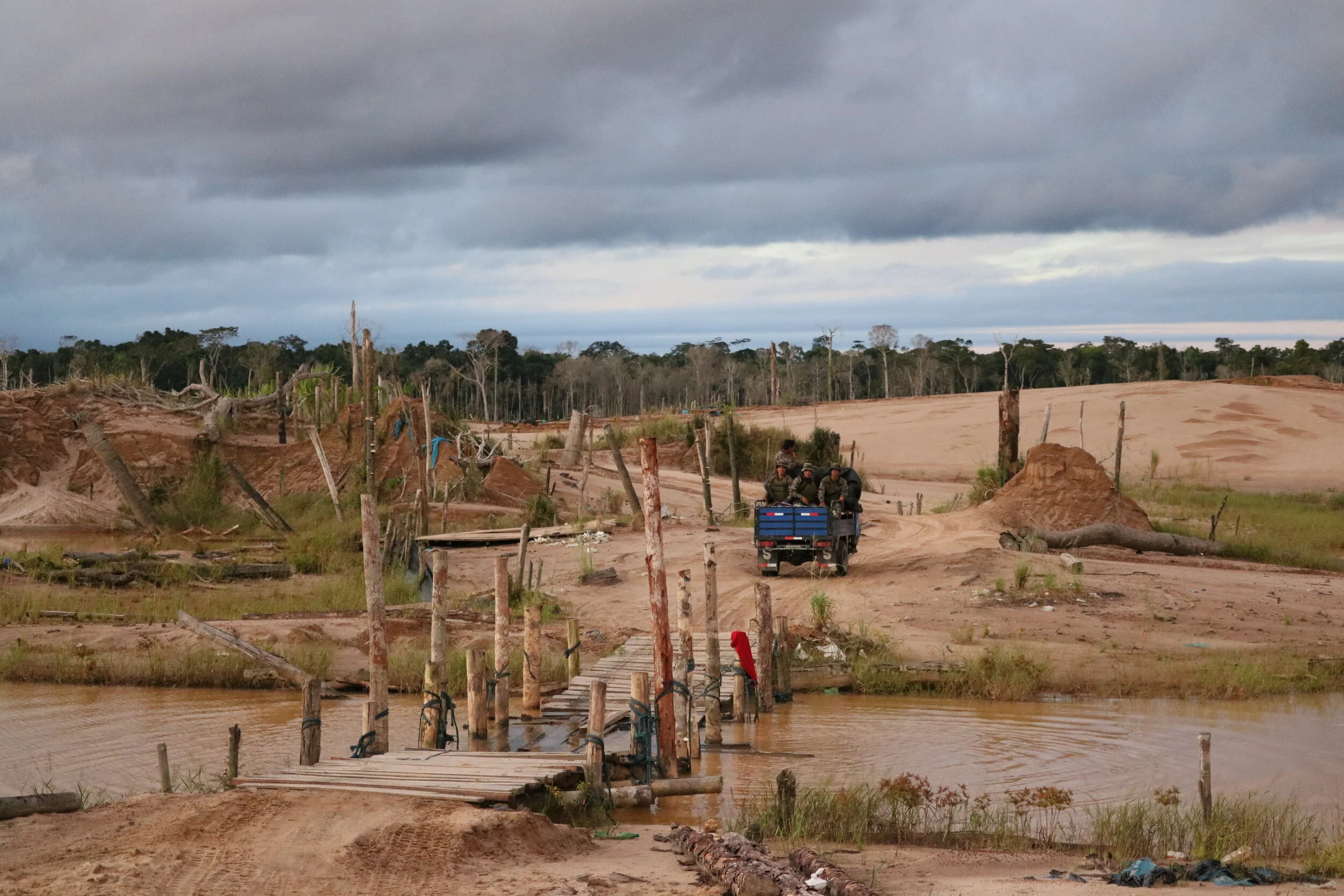 Peruvian soldiers destroy an illegal miner’s equipment as part of an ongoing state of emergency in the Amazon